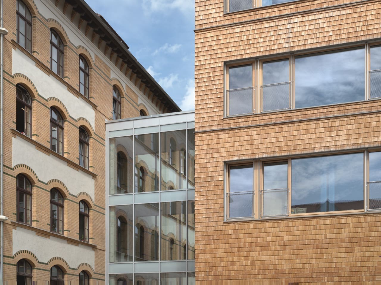 Die Fassadenbekleidung des Baukörpers besteht aus handgespaltenen Holzschindeln aus Lärchenholz und nehmen den Farbton der gelben Klinkerfassade des Altbaus auf. Die Unterrichtsräume in den Obergeschossen werden über großzügige Fensterbänder belichtet. Die niedrigen Brüstungen und die tiefen Fensterbänke bilden für die Schüler besondere Sitz- und Aufenthaltszonen.