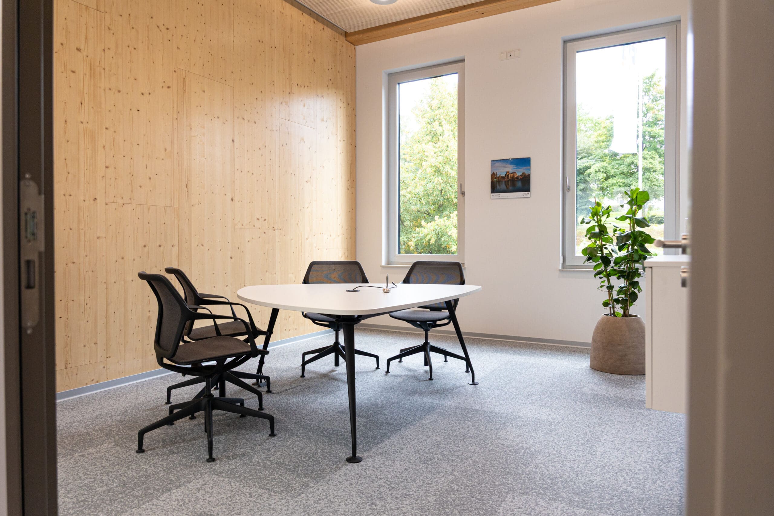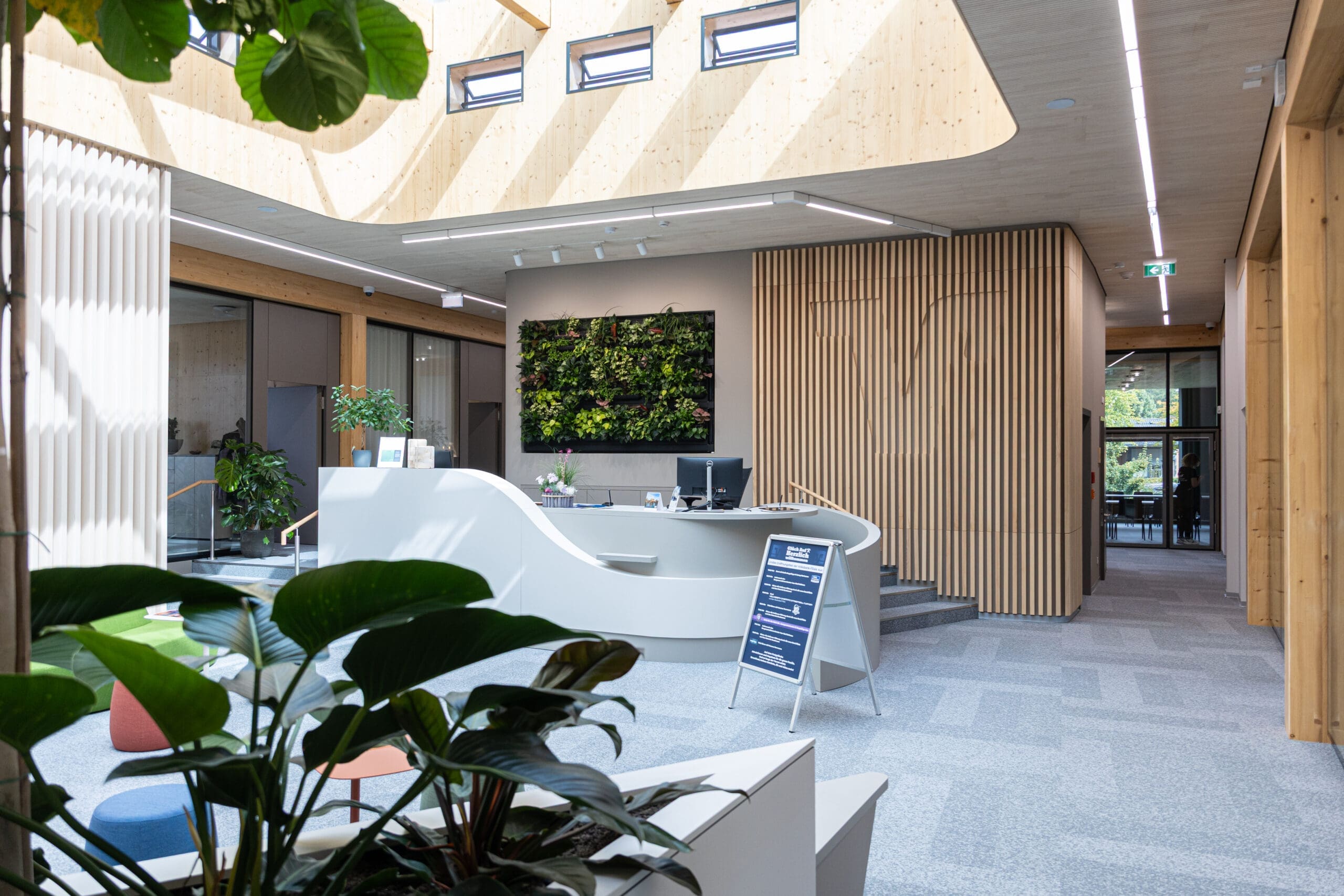 Auch im Innenraum bleibt Holz das prägende Gestaltungselement. In allen Räumen trägt es zu einer angenehmen Atmosphäre und höchster Aufenthaltsqualität für Kunden und Mitarbeitende bei.