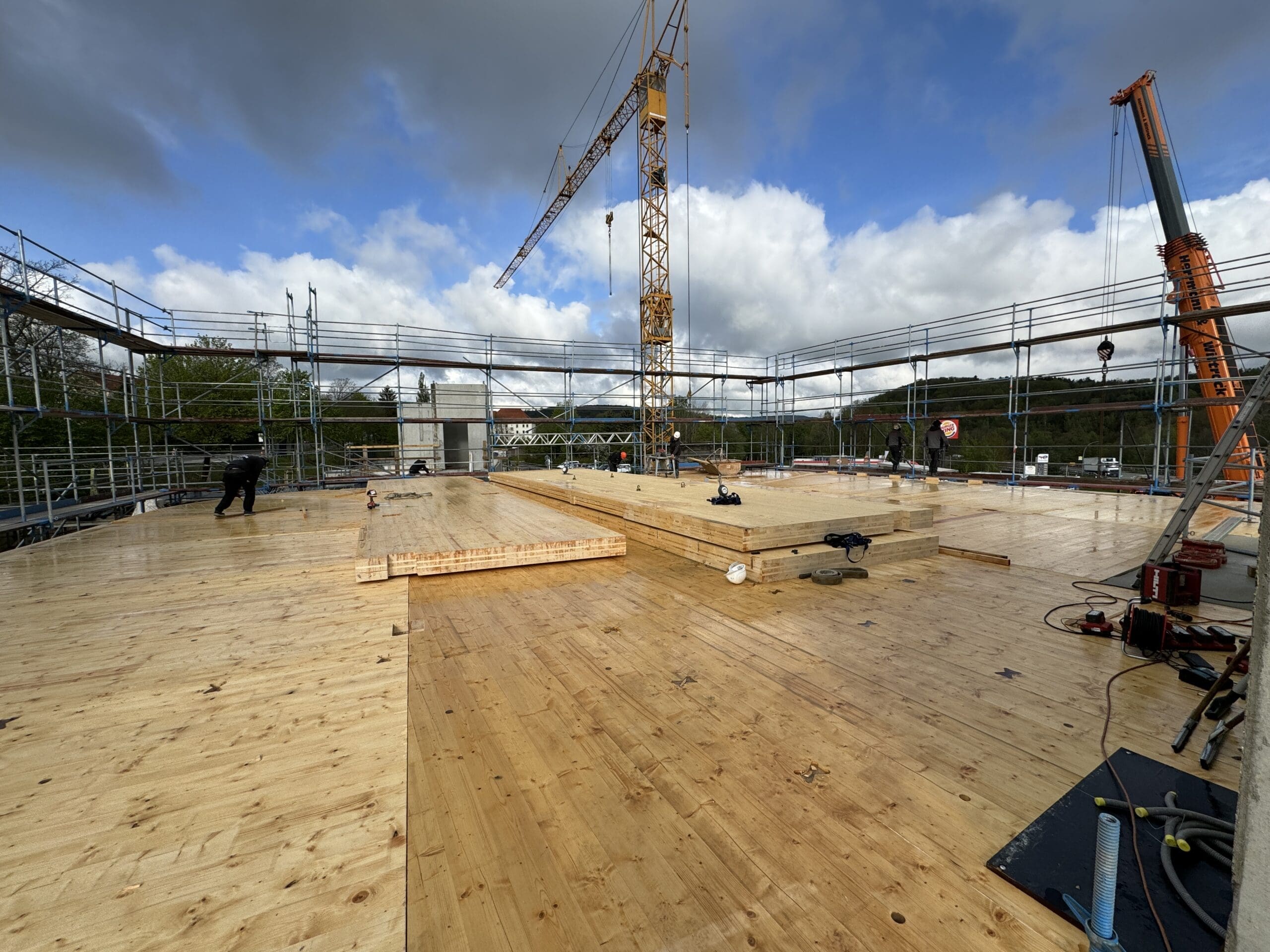 Ein Gebäudekomplex aus zwei modernen Bürogebäuden ist mit Fertigstellung im August 2025 in Aue-Bad Schlema entstanden. Die Volksbank Chemnitz eG entwickelte auf einer ehemaligen Brachfläche ein stimmiges Ensemble energieeffizienter Bürogebäude mit angrenzender Sport-, Grün- und Parkfläche. Der Baustoff Holz prägt sowohl die Gebäudehülle und die Tragkonstruktion als auch den Innenausbau des Bank- und Notargebäudes und sorgt für höchste Aufenthaltsqualität. Für die Ausführung der Holzbauarbeiten war die Teerhalle Holzbau GmbH verantwortlich.