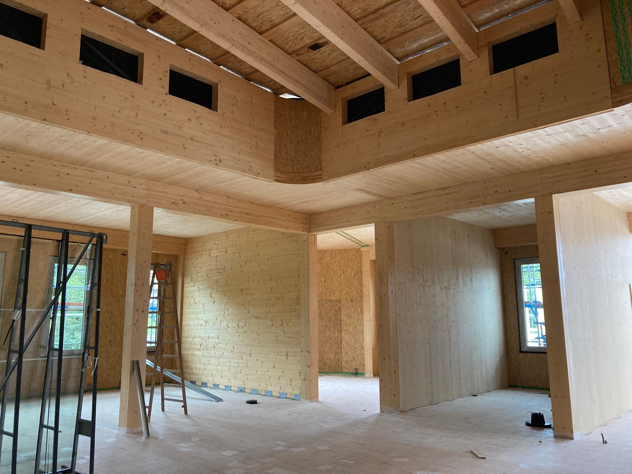 Ein durchdachtes Energiekonzept ergänzt die Vorteile des Holzbaus. Hohe Raumhöhen ermöglichen ein intelligentes Lüftungskonzept, zudem kommen umweltfreundliche Geothermie zum Heizen und Kühlen sowie eine vollflächige Photovoltaikanlage auf dem begrünten Flachdach zum Einsatz.