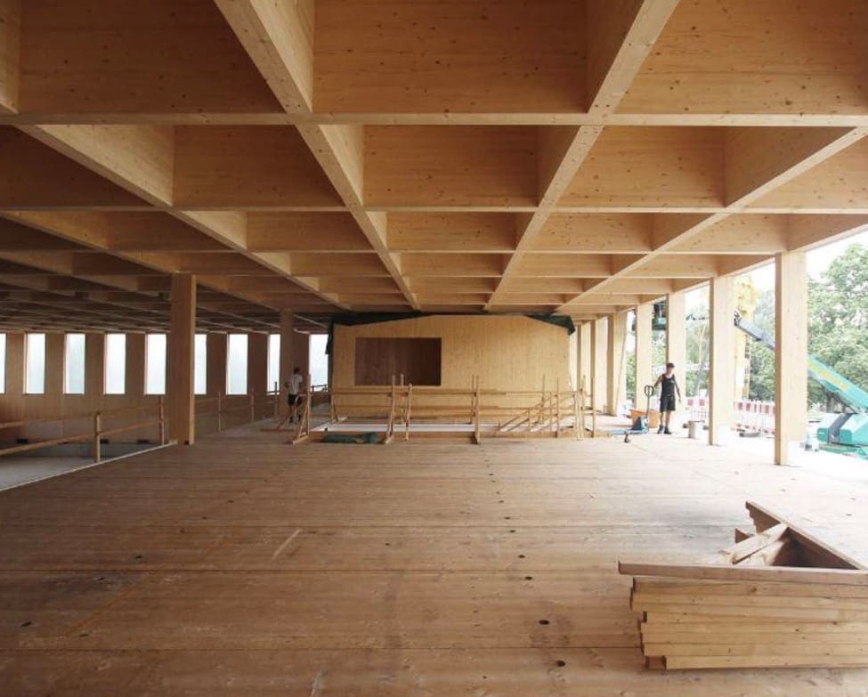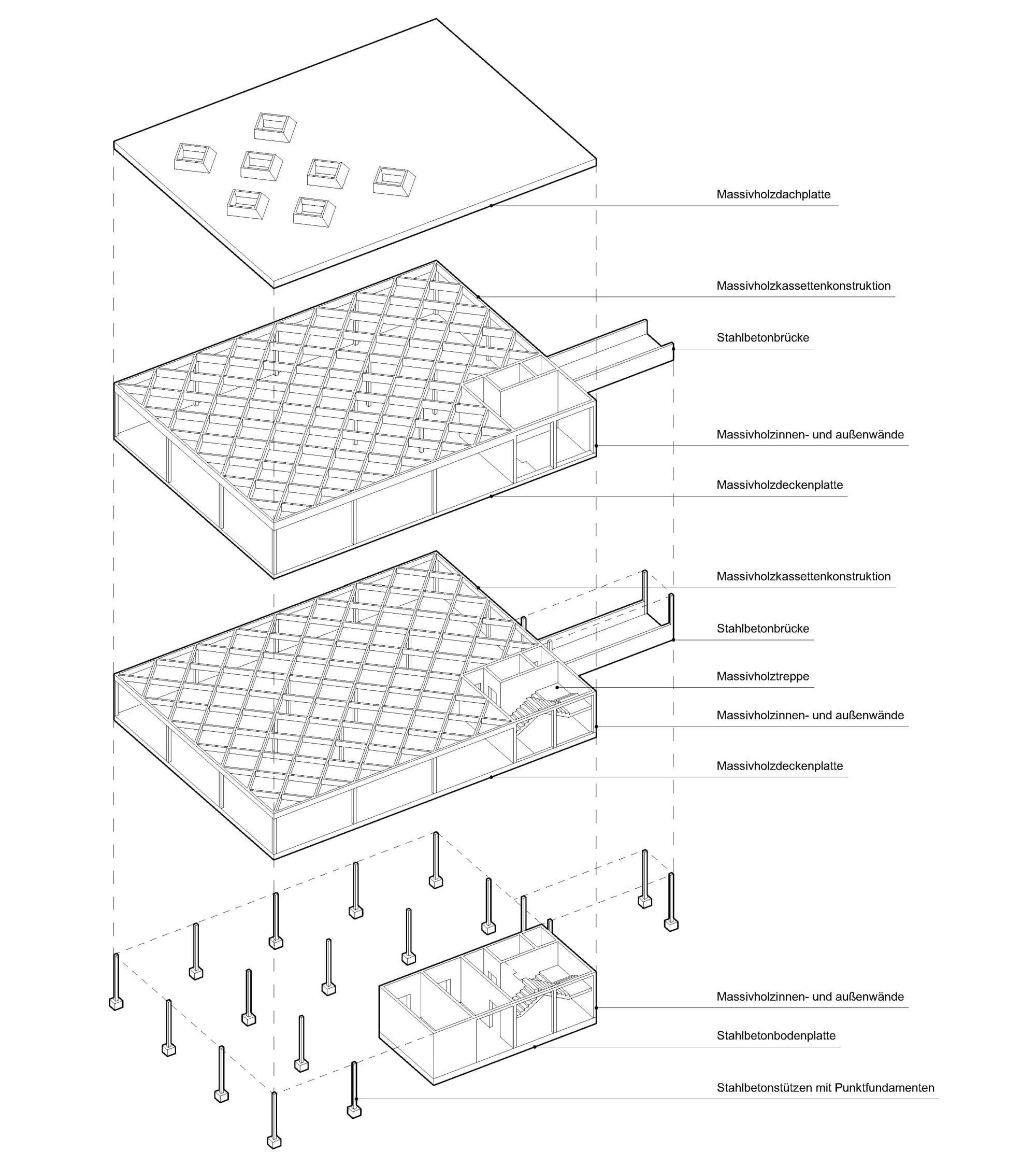Der Neubau wird als Holzhybridkonstruktion mit einem Holzbauanteil von rund 40 Prozent realisiert. Tragende Elemente aus Brettschichtholz aus Fichte sowie Furnierschichtholz aus Buche bilden gemeinsam mit Brettsperrholzbauteilen die Grundlage der Konstruktion. Ergänzt wird das System durch Holztafelaußenwände in Holzrahmenbauweise, die mit verschiedenen Holzwerkstoffen beplankt und mit einer vorvergrauten Holzlattung aus Fichte bekleidet werden.