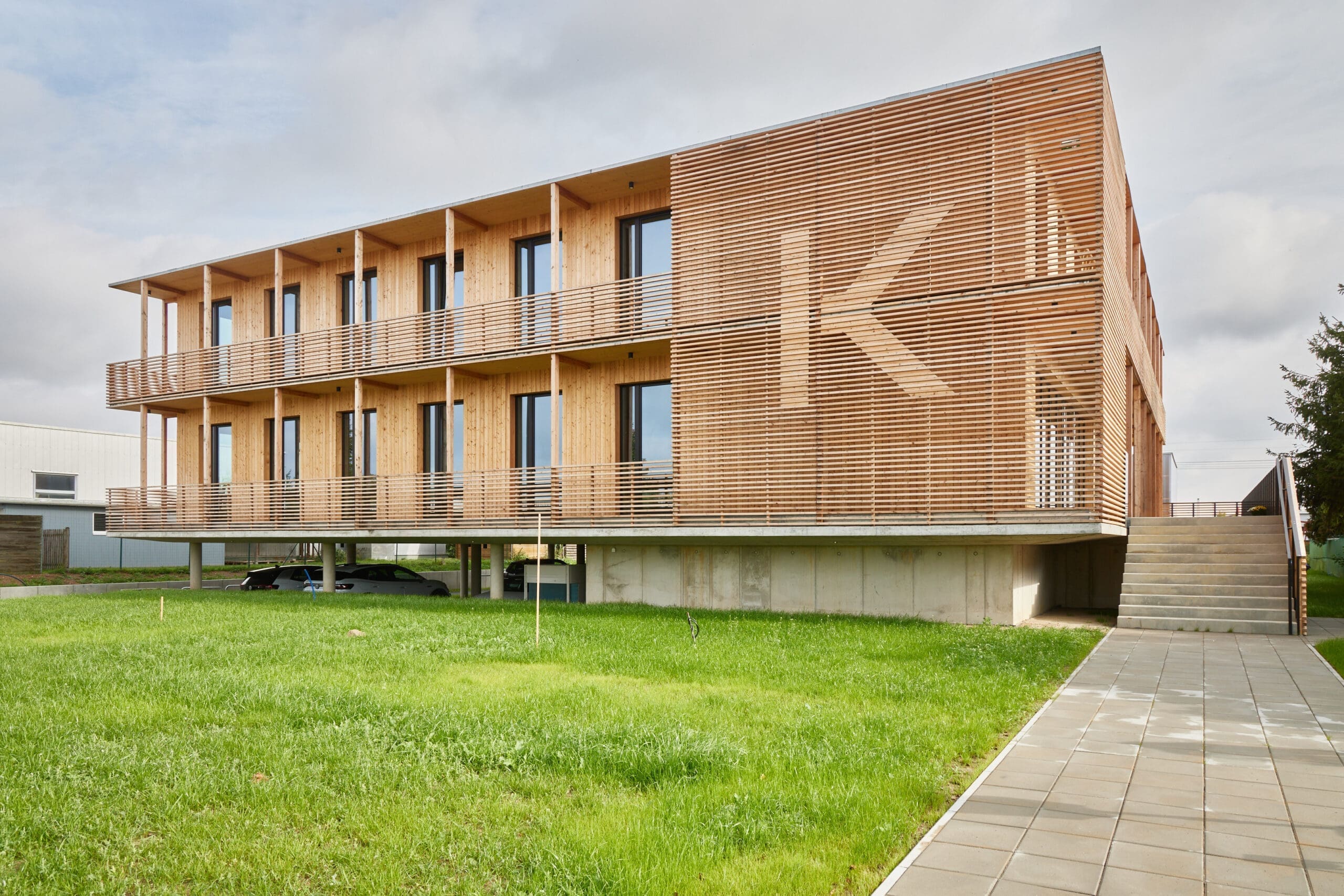 Der Neubau des Geschäftssitzes der Firma Kältepunkt GmbH in Borsdorf, OT Panitzsch soll vor allem eines nicht sein: altmodisch. Dafür hat das Leipziger Architekturbüro K.O.P. mit seinem Entwurf der beiden 2-geschössigen Gebäude in Holzbauweise gesorgt. Während das Bürogebäude durch seine klare vertikale Fassadengliederung mit umlaufender Balkonanlage und dem Einsatz weniger, naturbelassener Materialien besticht, wartet das Werkstattgebäude im hinteren Teil des Geländes mit einem filigranen Vordach aus 80 mm starken, auskragenden Brettsperrholzplatten und einer transparenten Fassade aus 40 mm starken Hohlkammerplatten auf, welche das Ständerwerk im Obergeschoss des Gebäudes nach außen sichtbar macht.