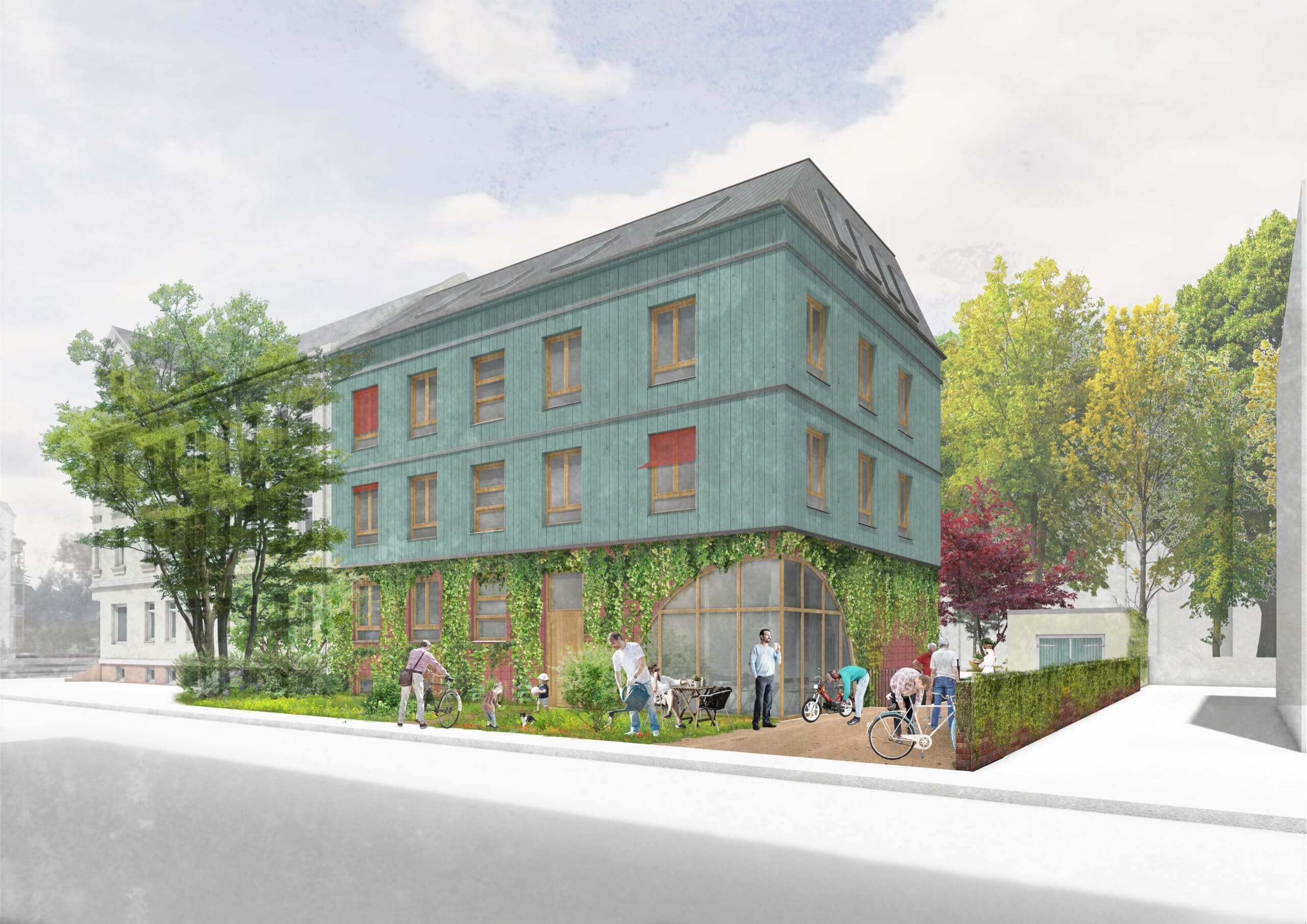 Für eine Baugruppe entsteht im Rahmen der Leipziger Konzeptvergabe ein mehrgeschossiges Wohngebäude in Holzbauweise. Durch die Zusammenlegung der Gemeinschaftsflächen sowie die Ausgestaltung der Wohnungen als flexibel unterteilbare WG-Wohnungen kann ein sehr geringer pro Kopf Verbrauch von Wohnflächen erreicht werden. Kellergeschoss, Brandwand und Treppenhaus werden in Stahlbetonbauweise errichtet, die primäre Konstruktion des Gebäudes wird aus Holzrahmenwänden und CLT-Decken hergestellt. Im Erdgeschoss wird die Fassade begrünt, in den Obergeschossen kommt eine Nut-Feder-Verschalung zum Einsatz.