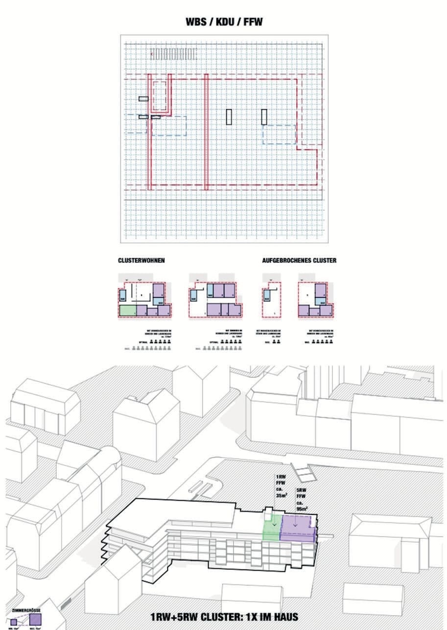 Das Gebäude wird barrierefrei errichtet. 19 der 34 Wohnungen sind als mietpreisgebundener und belegungsgebundener Wohnraum vorgesehen. Das Haus bietet zahlreiche Orte für gemeinschaftliches Leben, darunter eine Kantine und ein Nachbarschaftscafé, Dach- und Hofgärten, Laubengänge sowie Gemeinschaftsräume.