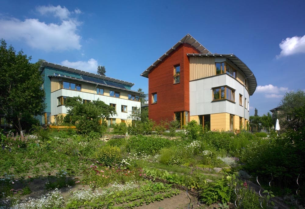 Die Gebäude wurden in Holzrahmenbauweise aus Holz-Doppel-Profilen und Zellulosedämmung errichtet. Die Außenwand wurde über 3 Geschosse durchgehend aufgestellt und dann erst innenseitig mit Wänden und Decken aus Konstruktionsvollholz ausgebaut, um windundichte Wand-Deckenanschlüsse zu vermeiden. Die Fensterflächen wurden auf circa 30% begrenzt, um eine Überhitzung im Sommer zu vermeiden. Lehmbau in Teilbereichen ergänzt den Holzbau sinnvoll.