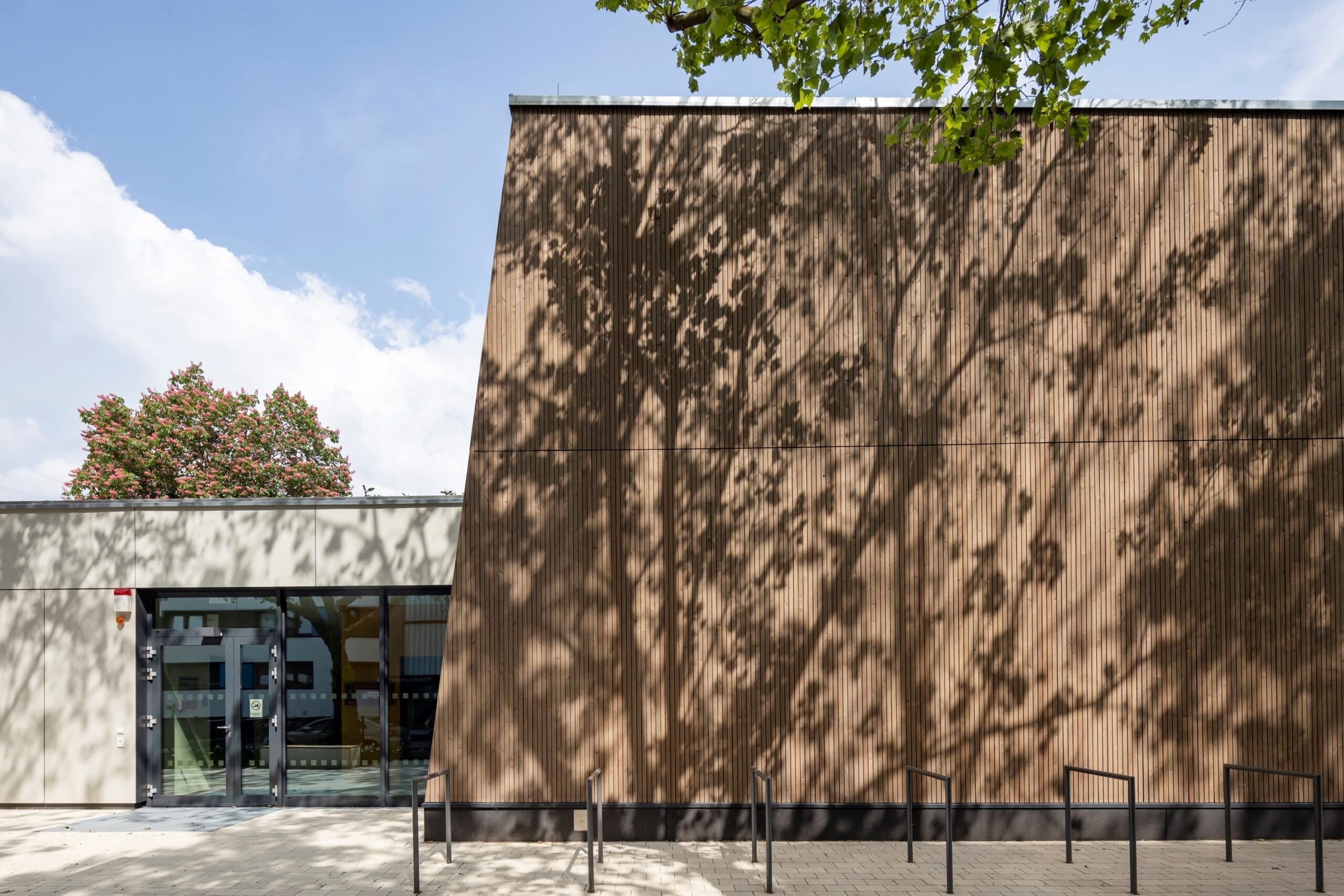 Die Materialwahl stellt Holz als natürlichen Baustoff in den Mittelpunkt der Konstruktion, Gestaltung, Haptik und Farbgebung. Wenige und dezent platzierte Verglasungen versorgen die wesentlichen Innenräume mit Tageslicht und optimieren so die Betriebskosten. Bestehende Baumstellungen stehen dabei im Dialog mit der neuen Sporthalle. Die vorgehängte Holzfassade aus vertikaler Profilbrettschalung zeichnet mit vorpigmentierten gleichmäßigen Lamellen ein homogenes Erscheinungsbild und hält so den gewichtigen Flächen des städtebaulichen Umfeldes Stand.