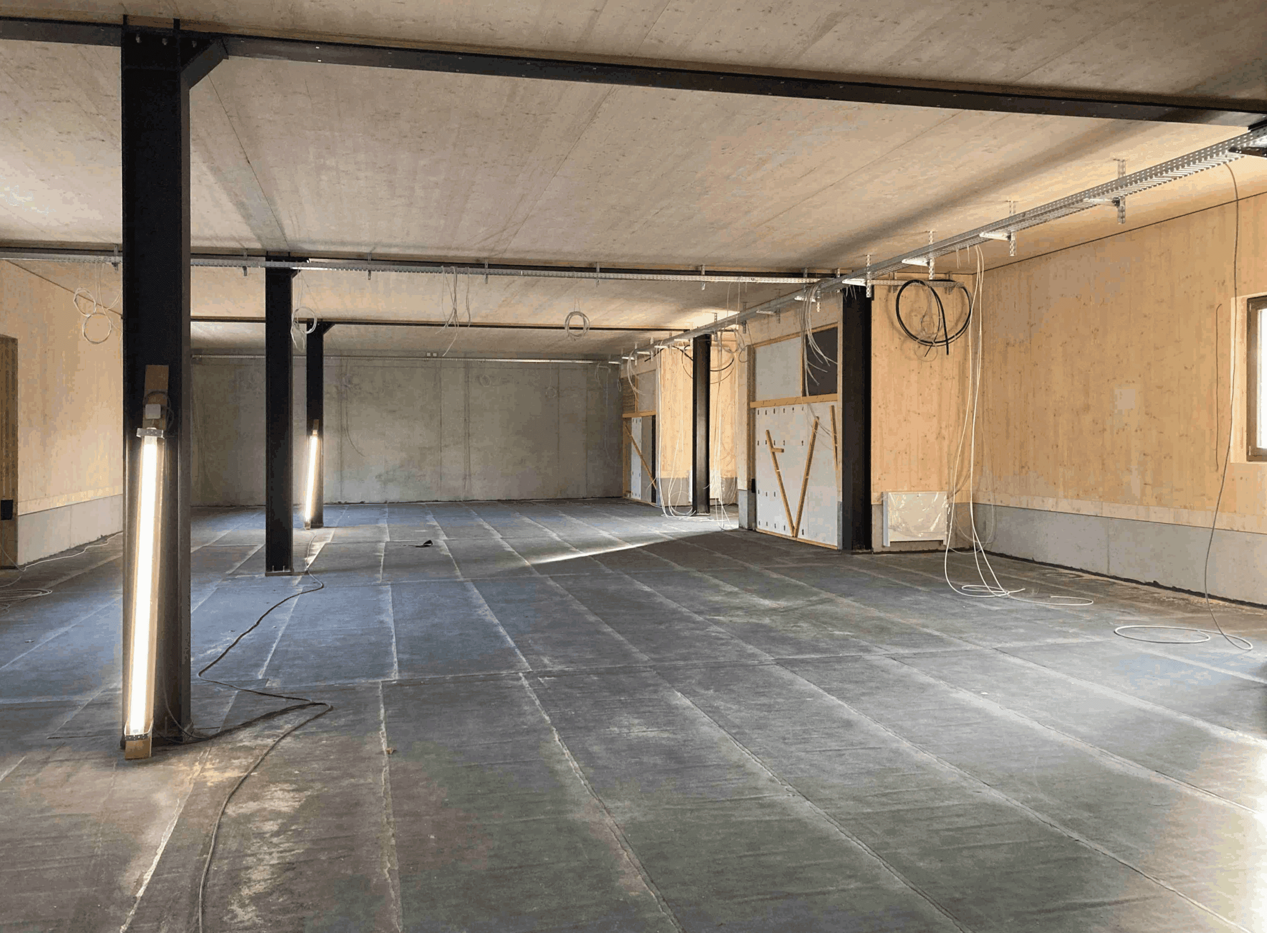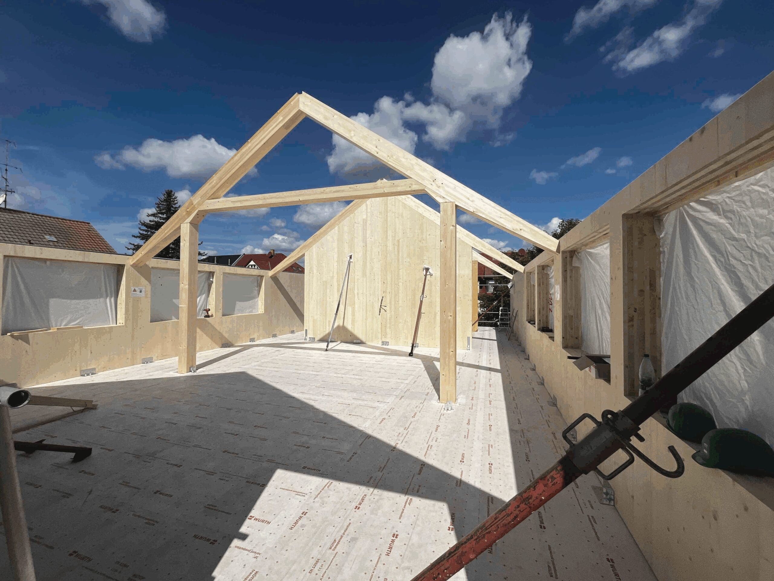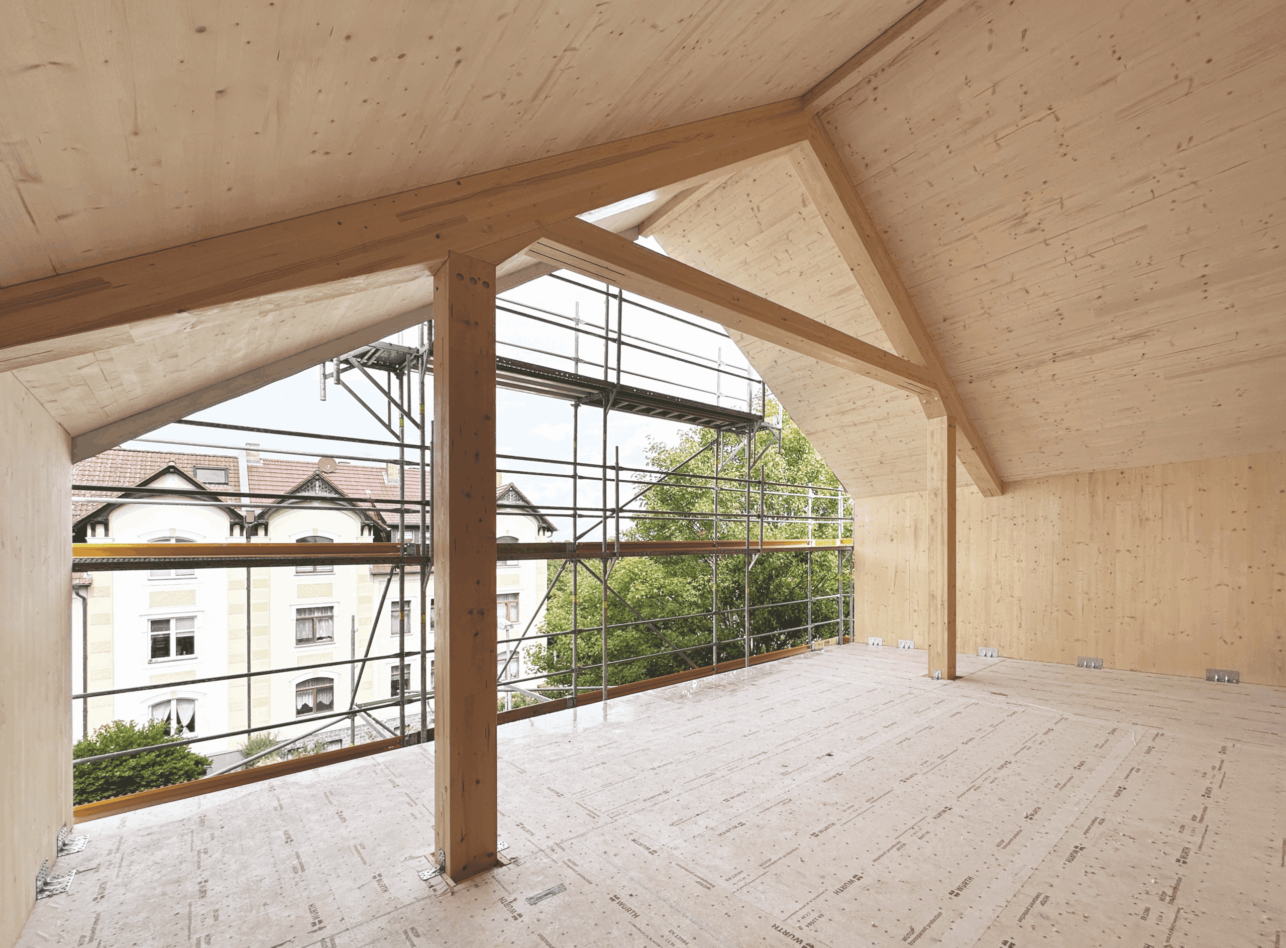 In Beucha entsteht derzeit parallel zur Sanierung des ehemaligen hist. Kulturhauses ein dreigeschossiges Werkstatt- und Bürogebäude (Nutzungsklasse 2) in Holzmassivbauweise aus kreuzweise verklebtem Fichtenbrettsperrholz. Zum Teil kommen tragende und aussteifende Stahlbetonbauteile zum Einsatz. Im Gebäude sind Brettschichtholz- sowie HEB-Stahlstützen verbaut.