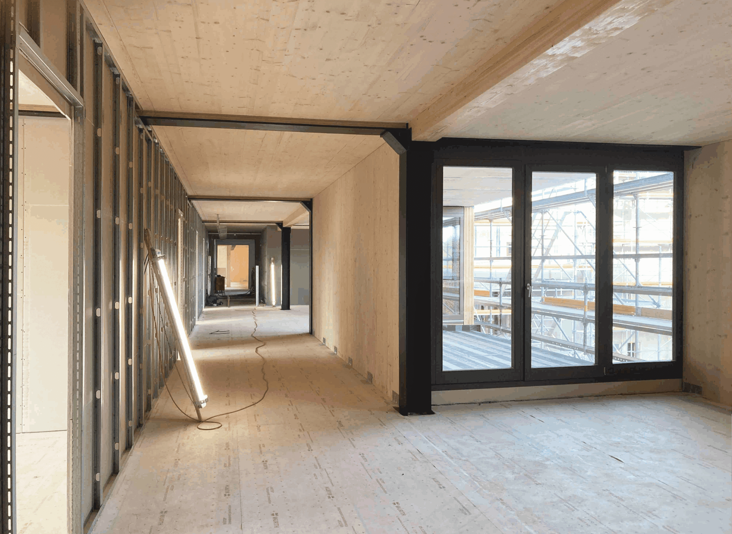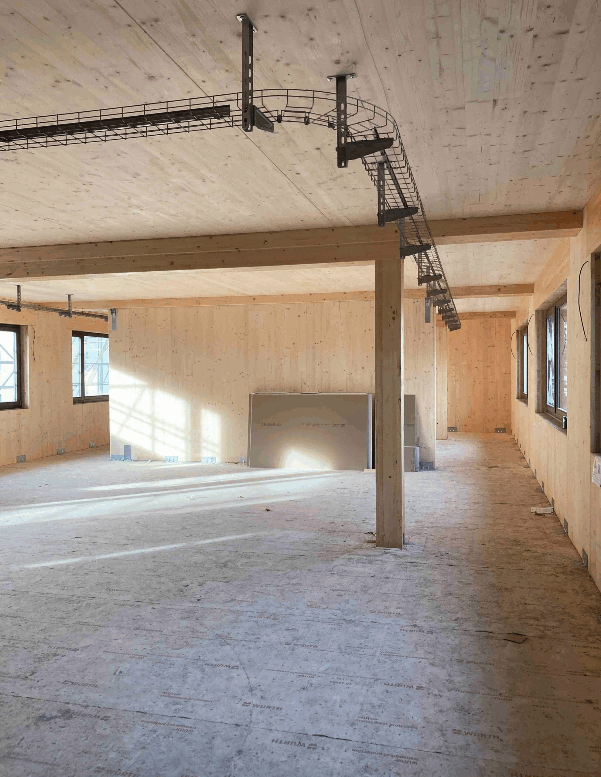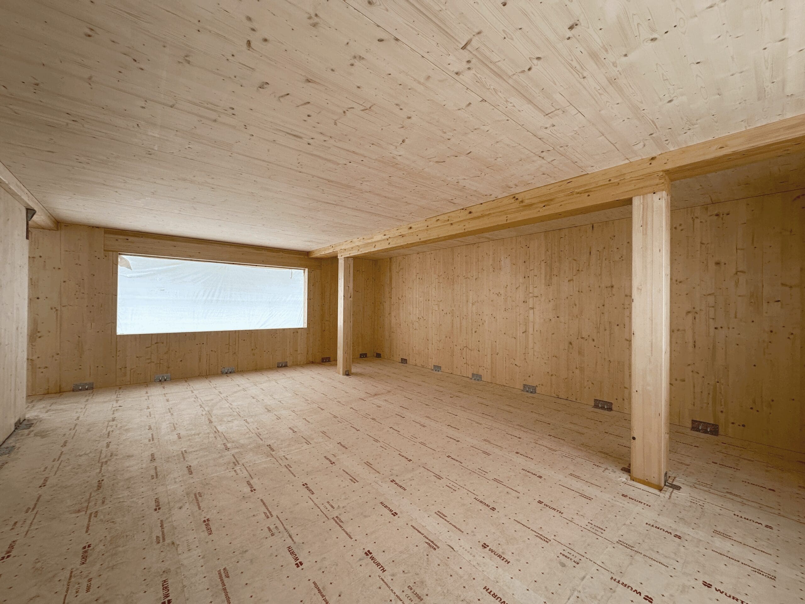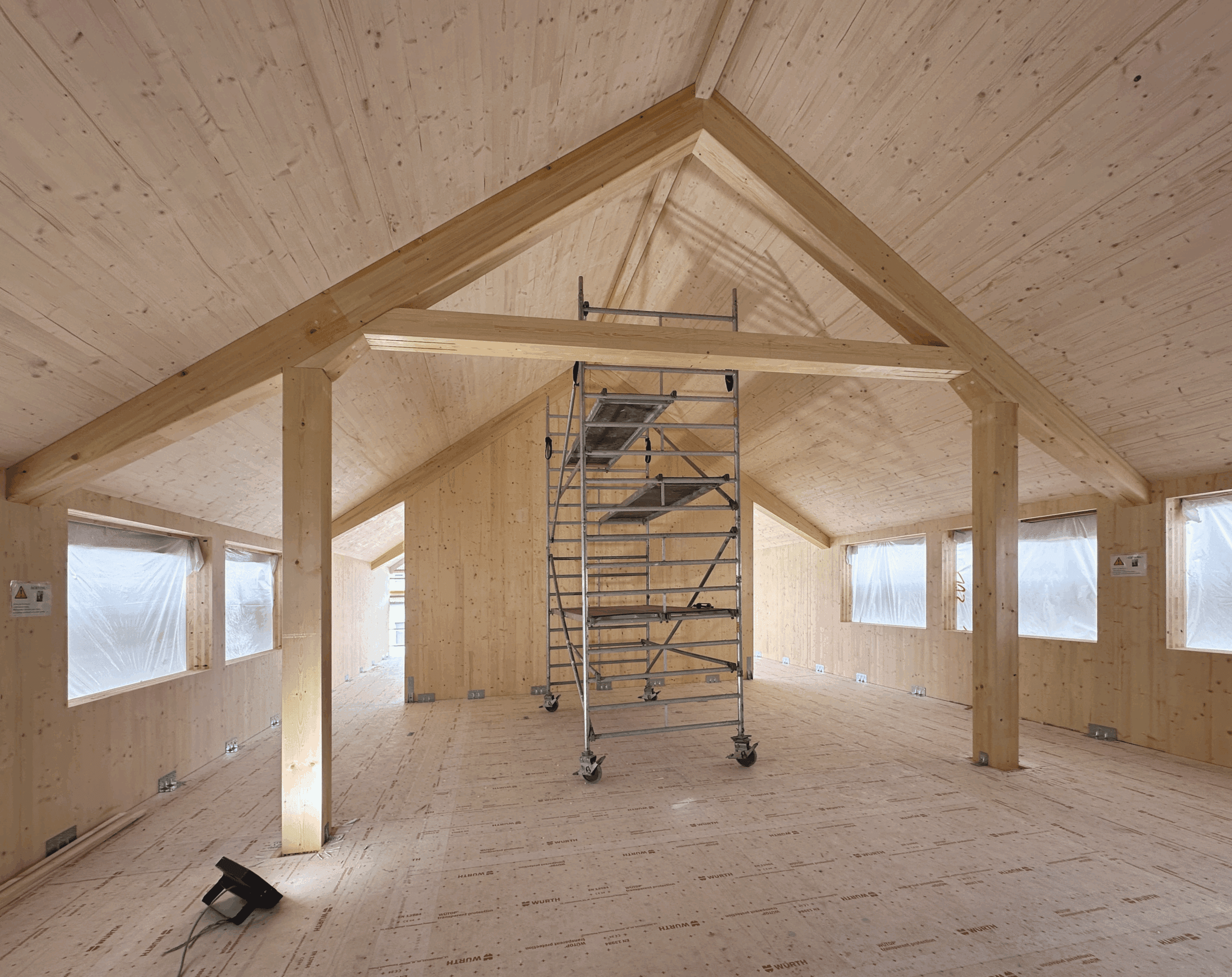 Im Innenraum bleiben die Oberflächen des Holzmassivbaus größtenteils sichtbar, wodurch der Charakter des Holzbaus zur Geltung kommt.