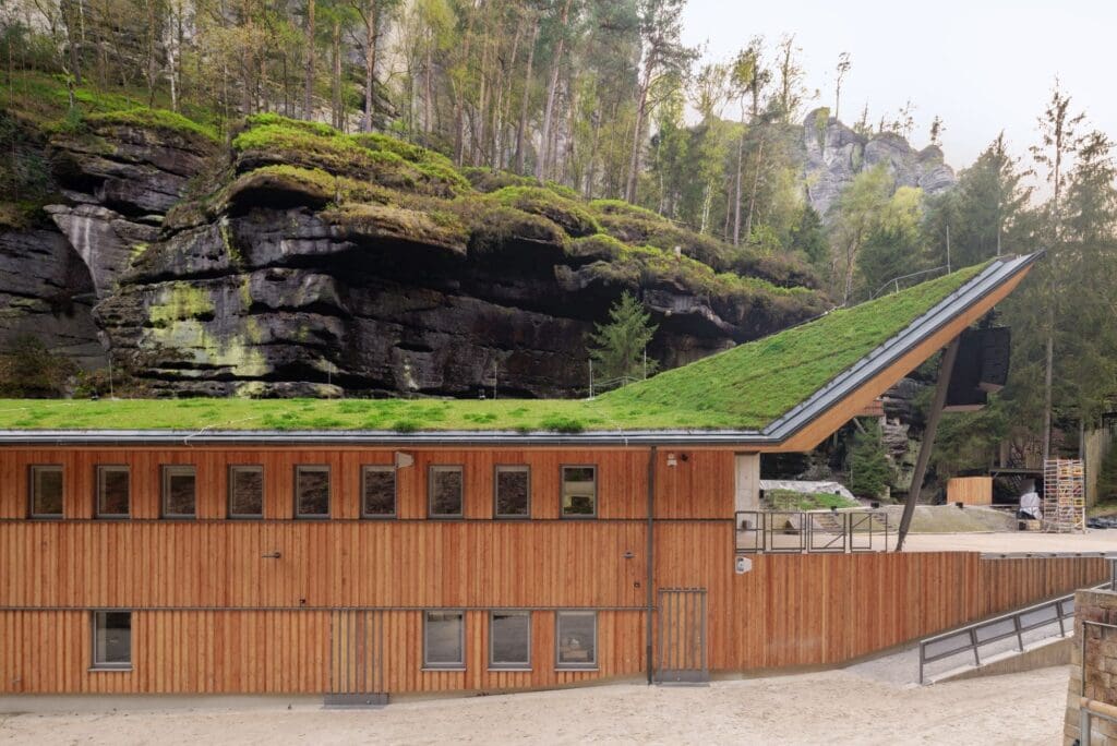 Die Einfügung in die umgebende Natur, inmitten des Nationalparks Sächsische Schweiz, war ein wesentlicher Schwerpunkt des Entwurfs. Dafür wurde die Baumasse möglichst kompakt organisiert und passgenau in die Topografie des engen Talkessels eingefügt. Das üppige begrünte Dach lässt das Gebäude beim Blick von der umgebenden Felslandschaft zwischen den Bäumen verschwinden, während die klassische Holzfassade aus Lärchenholz aus dem Tharandter Wald Bezüge zu typischen Bauten des Landschaftsraums aufnimmt. Die polygonal-unregelmäßige Grundrissform in Verbindung mit der horizontaler Fassadengliederung verweisen auf die Formenwelt der markanten Sandsteinfelsen.